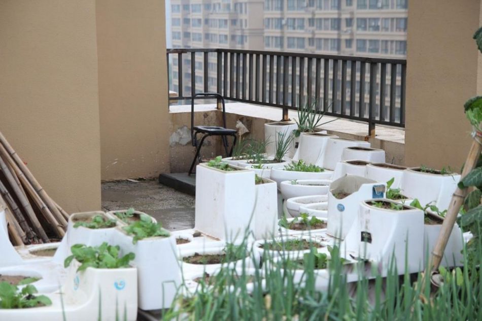 A roof-top vegetable garden with abandoned closestools appears in Heze, east China's Shandong Province, July 16, 2015. (Photo/iqilu.com)