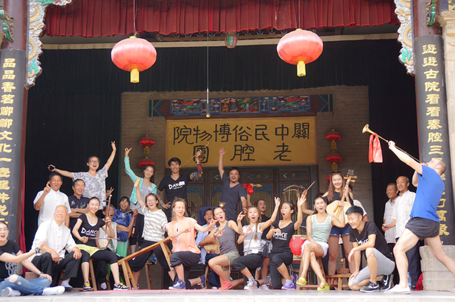 Teachers and students pose for a group photo on a traditional Chinese stage.[Photo by Xu Jing/Chinaculture.org]