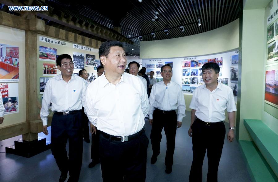Chinese President Xi Jinping (front) visits an exhibition about the development of Yanbian in Yanbian Korea Autonomous Prefecture, northeast China's Jilin Province, July 16, 2015. Xi made an inspection tour in Jilin from July 16 to 18. (Xinhua/Ju Peng)