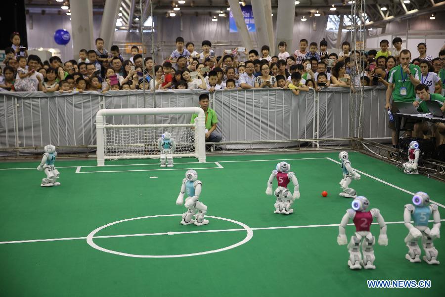 Robots play football during the 19th RoboCup in Hefei, capital of east China's Anhui Province, July 19, 2015. More than 2,000 participants from 47 countries and regions took part in the major and junior teams competitions. (Xinhua/Jin Liwang)