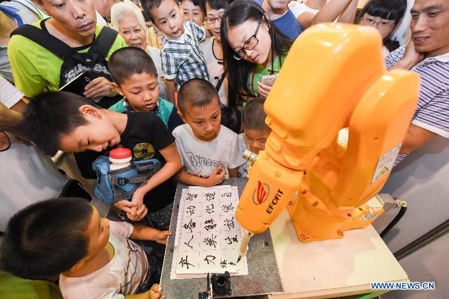 A robot writes calligraphy works at the International Expo Center where the 19th RoboCup is held in Hefei, capital of east China's Anhui Province, July 19, 2015. More than 2,000 participants from 47 countries and regions took part in the major and junior teams competitions. (Xinhua/Zhang Duan)