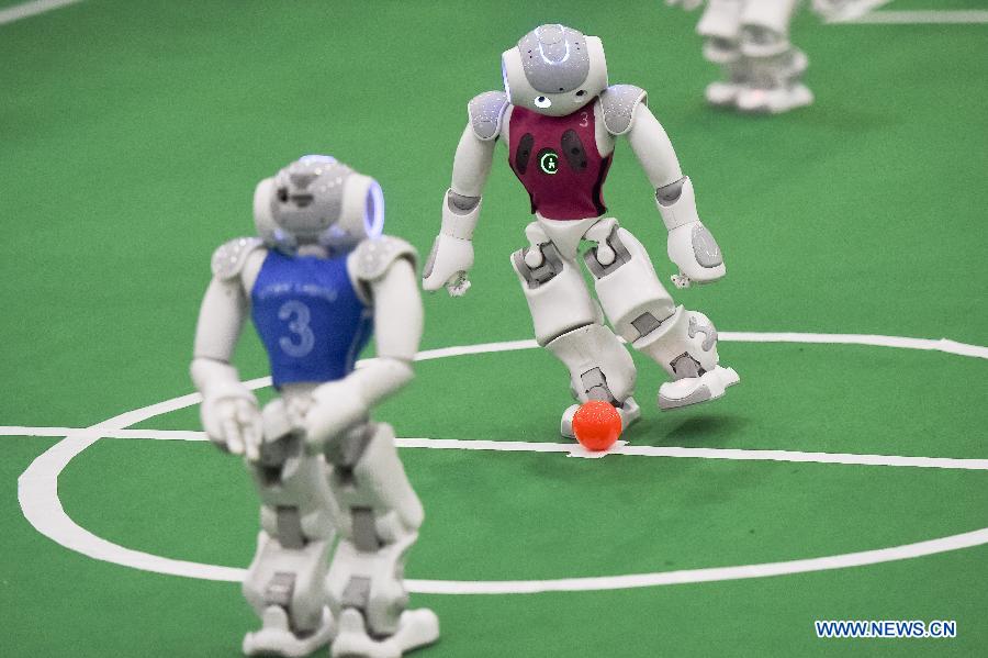 Robots play football during the 19th RoboCup in Hefei, capital of east China's Anhui Province, July 19, 2015. More than 2,000 participants from 47 countries and regions took part in the major and junior teams competitions. (Xinhua/Zhang Duang)