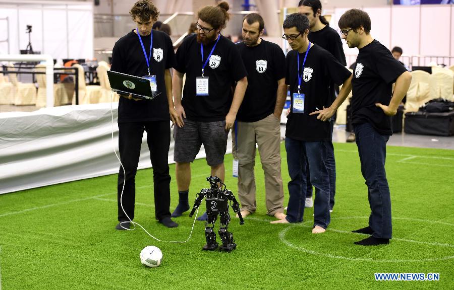 Participants adjust their robot at the 19th RoboCup in Hefei, capital of east China's Anhui Province, July 19, 2015. More than 2,000 participants from 47 countries and regions took part in the major and junior teams competitions. (Xinhua/Liu Junxi)