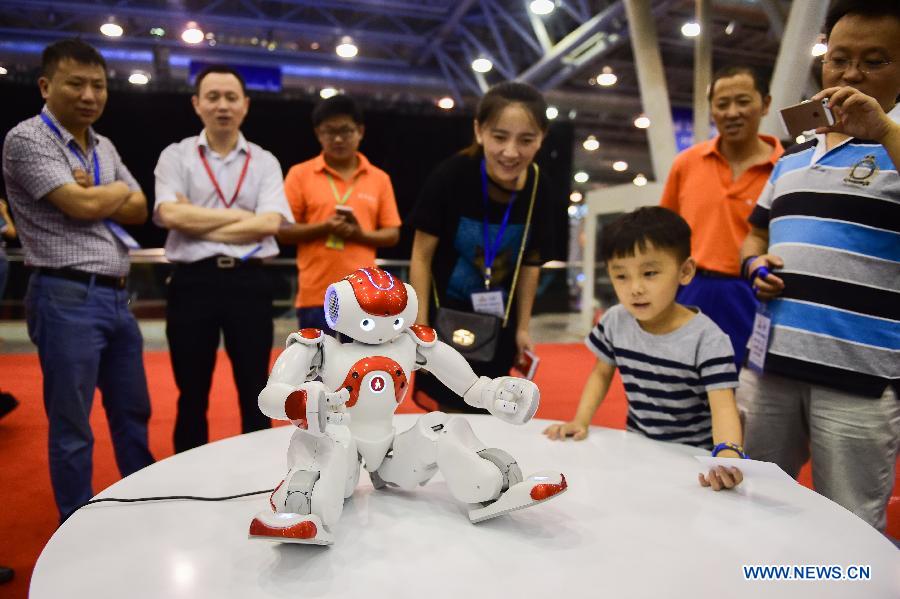 A boy plays with a robot at the International Expo Center where the 19th RoboCup is held in Hefei, capital of east China's Anhui Province, July 19, 2015. More than 2,000 participants from 47 countries and regions took part in the major and junior teams competitions. (Xinhua/Du Yu)