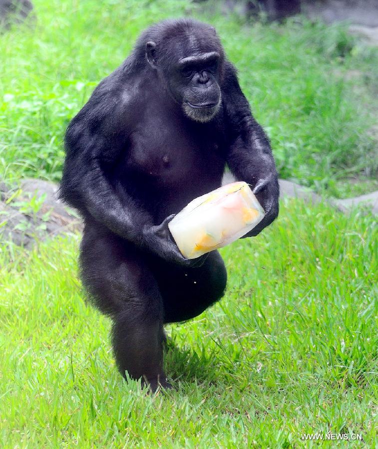 A chimpanzee holds an ice cube filled with its favorite fruit to cool off at the Taipei Zoo in Taipei, southeast China's Taiwan, July 19, 2015. Taipei Zoo gave animals some special cooling treats due to the weather these days. (Xinhua)