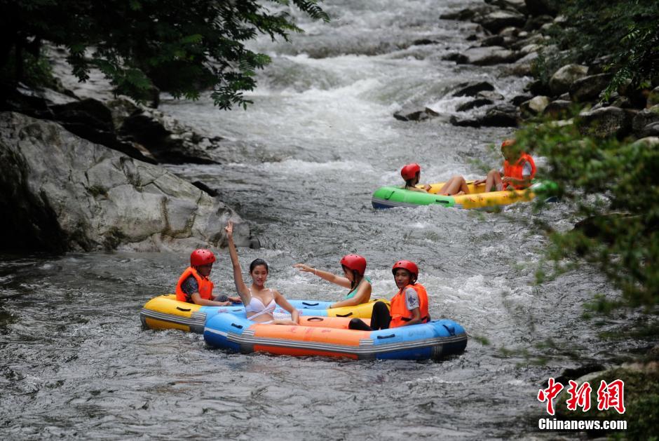 Charming bikini lifeguards appear in the river rafting place in Lianyunshan Mountain in Pingjiang, central China’s Hunan province on July 19, 2015. Those bikini girls sit with tourists in the same raft to protect their safety. (CNS/Yang Huafeng)