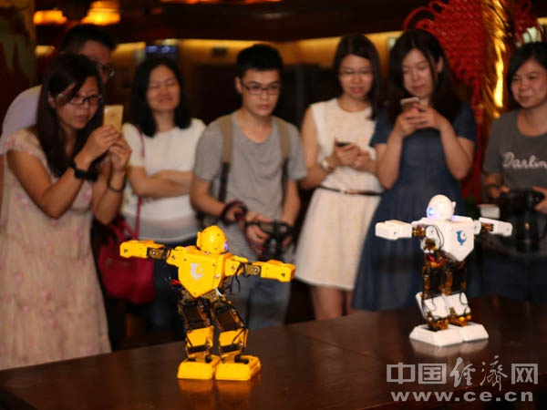 Two robots dance to the music of "Gangnam Style" at the seminar. (Photo/ ce.cn)