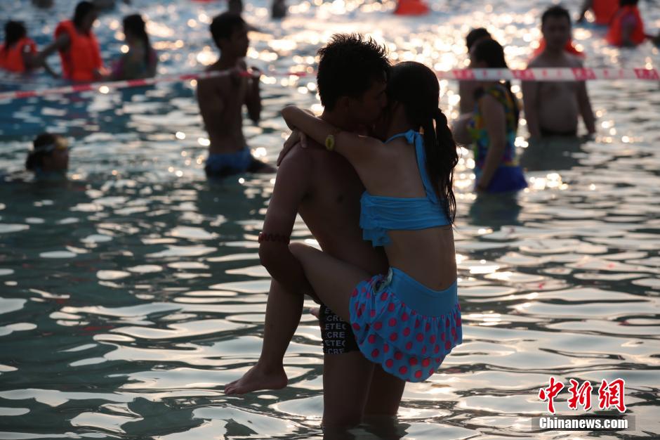 An interesting kiss contest is held in a water world in Nanning, south China’s Guangxi province on July 18, 2015. The male contestant held his partner up and kissed her in the water and the couple who held on the longest time would win. (CNS/Wang Gang)