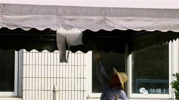 The metal panel fell from the sky around 3am on Monday and hit the patio of Fusheng Co on Minyi Road in the Xinqiao Industrial Zone in Songjiang District.