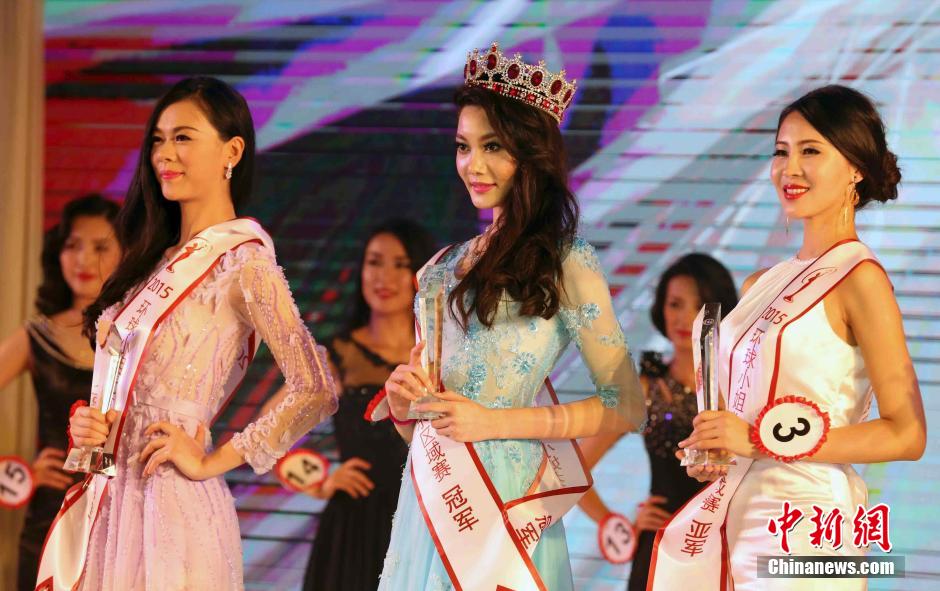 Lang Zhennan (C), winner of Miss Universe China Beijing Final 2015, poses with the runner-up (R) and the second runner-up (L) in the awarding ceremony during the Beijing regional final of the 2015 Miss Universe China Pageant in Beijing, July 19, 2015. (CNS/Ren Haixia)