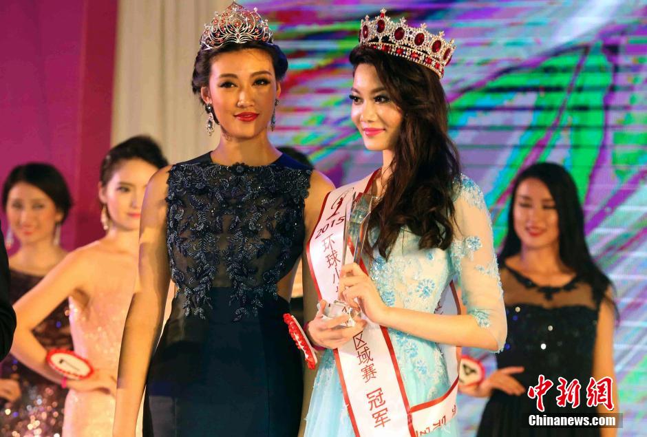 Hu Yanliang (L), winner of Miss Universe China 2014, poses with Lang Zhennan (R), winner of Miss Universe China Beijing Final 2015, during the Beijing regional final of the 2015 Miss Universe China Pageant in Beijing, July 19, 2015. (CNS/Ren Haixia)
