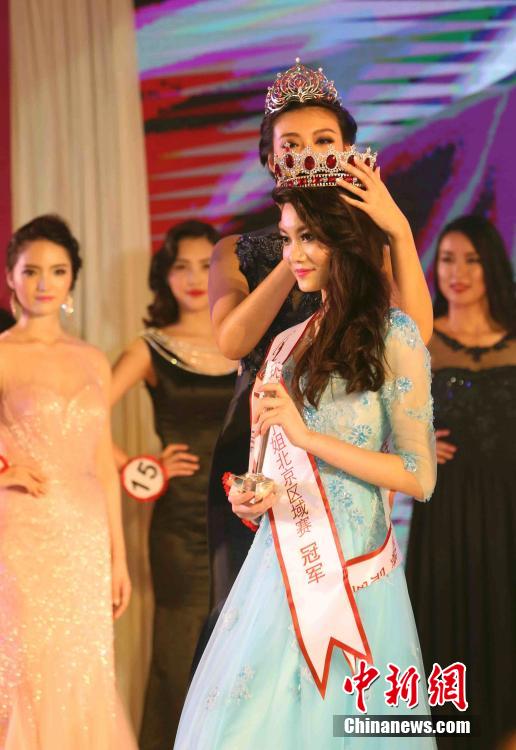 Hu Yanliang (L), winner of Miss Universe China 2014, puts the crown on the head of Lang Zhennan (R), winner of Miss Universe China Beijing Final 2015, during the Beijing regional final of the 2015 Miss Universe China Pageant in Beijing, July 19, 2015. (CNS/Ren Haixia)