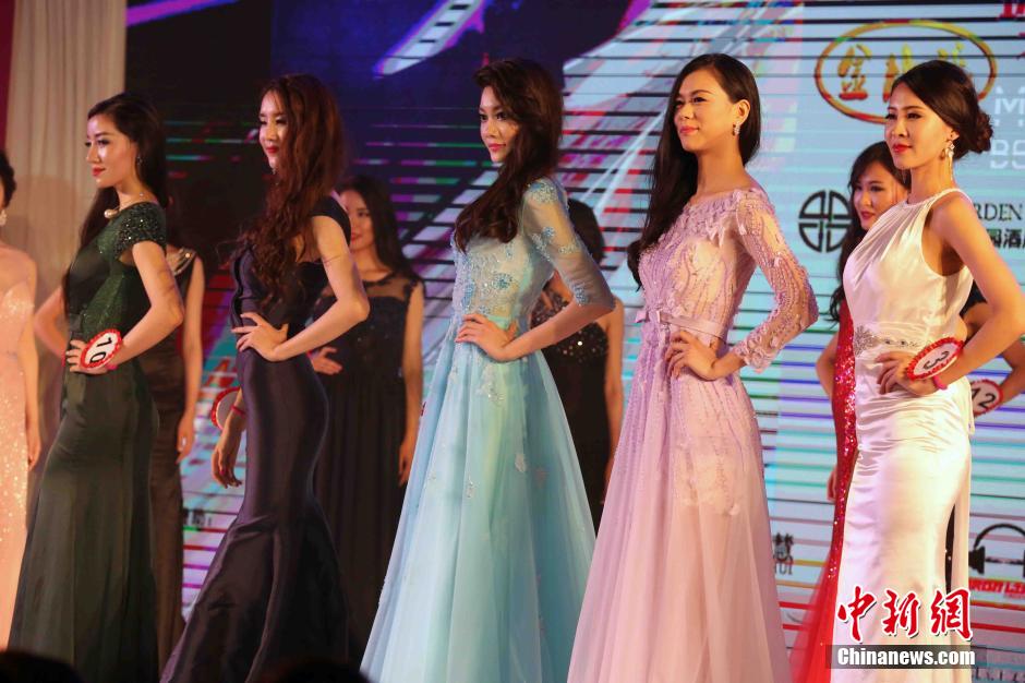 Contestants pose during the Beijing regional final of the 2015 Miss Universe China Pageant in Beijing, July 19, 2015. (CNS/Ren Haixia)