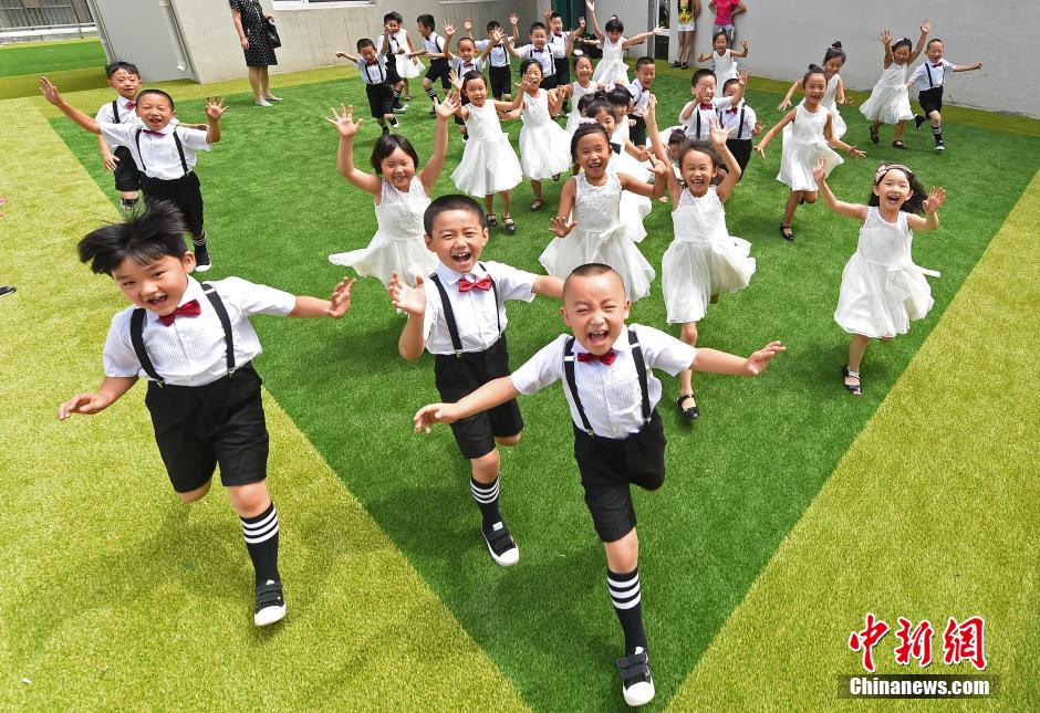 Girls and boys pose for kindergarten graduation photos in Taiyuan, north China’s Shanxi province on July 21, 2015. (CNS/Wu Junjie)