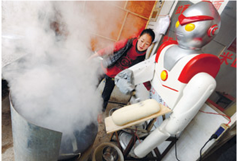 A robot in a sliced noodles shop in Wuhan, capital city of central China's Hubei province has become very popular recently. It was nearly two meters high and looks like Ultraman. He shaves a bowl of noodles with only 10 seconds or so, much faster than an ordinary worker. Since the customized robot began to work from November 2013, it has never failed to operate and was called an "excellent staff member".