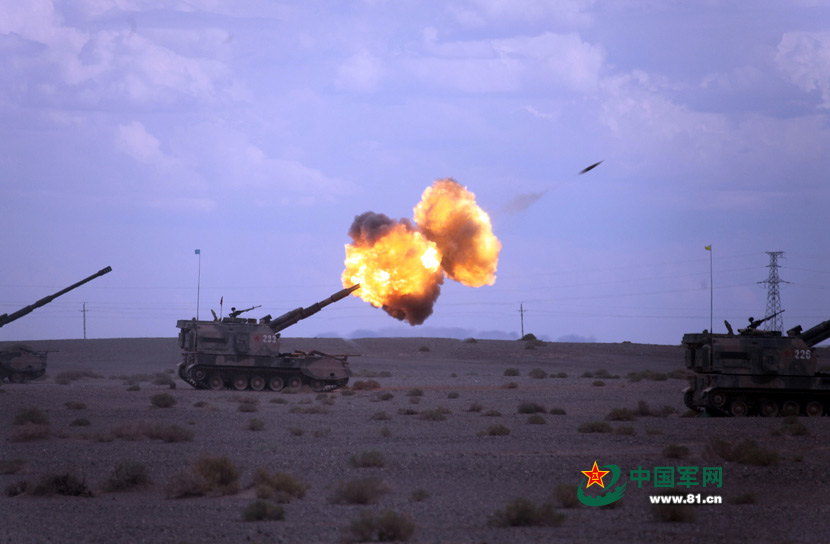A new-type self-propelled gun fires in a live fire drill held by the 1st Group Army in the desert on July 21, 2015. (Photo/www.81.cn)