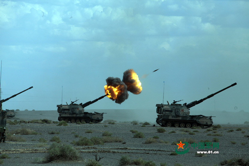 A new-type self-propelled gun fires in a live fire drill held by the 1st Group Army in the desert on July 21, 2015. (Photo/www.81.cn)