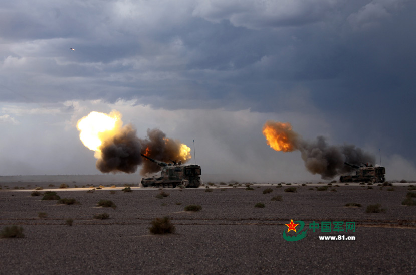 A new-type self-propelled gun fires in a live fire drill held by the 1st Group Army in the desert on July 21, 2015. (Photo/www.81.cn)