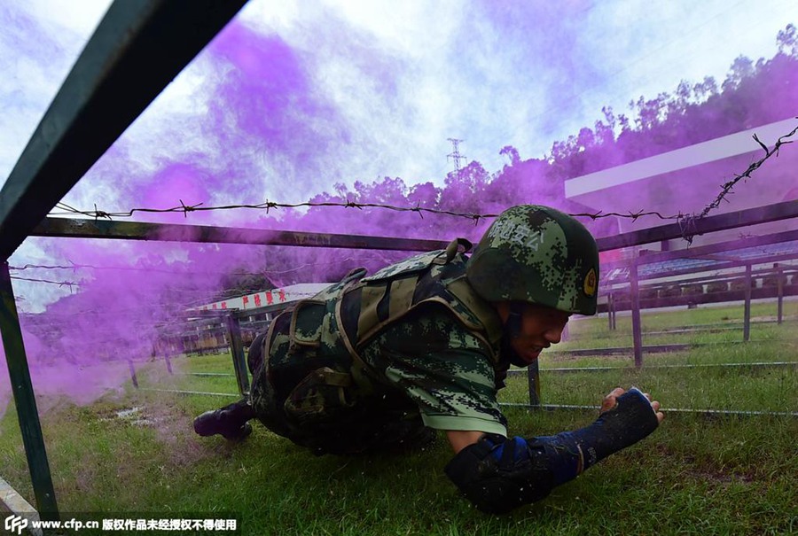 The SWAT team of People's Armed Police Frontier Corps in Guangdong, also known as the "iron army", held a military skill competition under thunderstorm in the heat on July 22, 2015. Five teams, 31 groups, and about 231 SWAT team members joined the competition. The contest will last three days.