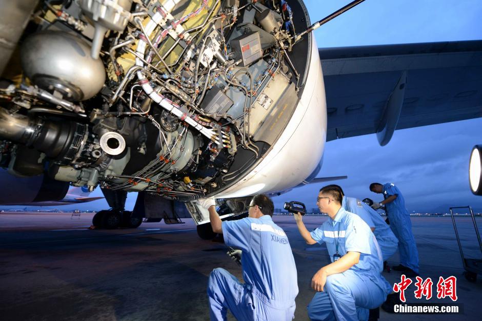Engineers maintain a plane. (CNS/Wang Dongming)