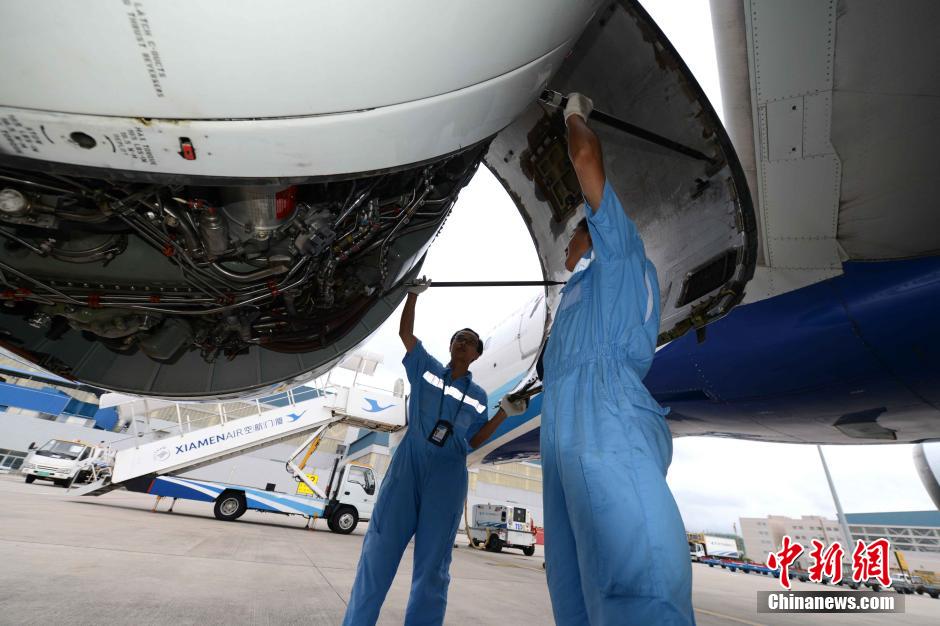 Engineers maintain a plane. (CNS/Wang Dongming)