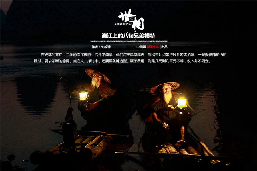 86-year-old Huang Quande and 76-year-old Huang Yuechuang are brothers living in Guilin, south China’s Guangxi. Last year, Guilin karst landform was selected as a world heritage site. Since 2003, Huang Yuechuang has started his business of taking photos with tourists. In 2008, his elder brother Huang Quande joined him as fishermen models after he left the acting team of Impression Liu Sanjie, which was directed by Zhang Yimo.