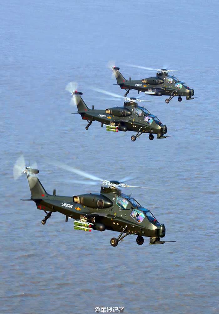 WZ-10 helicopters carrying missiles under the Nanjing Military Area Command (MAC) of the Chinese People's Liberation Army (PLA) conduct a drill over the sea on July 21, 2015. (81.cn/Photo)