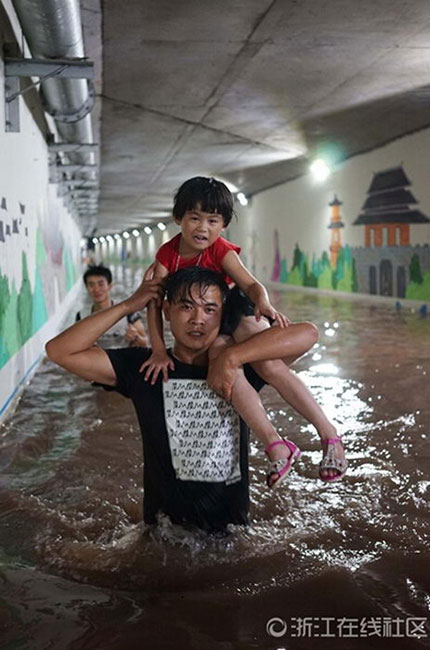 A whole family swimming to the railway station in Zhejiang (4)