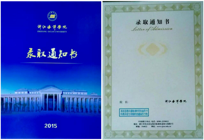 The letter of admission from Zhejiang Ocean University is in blue, just like the color of the ocean. (Photo/People's Daily Online)
