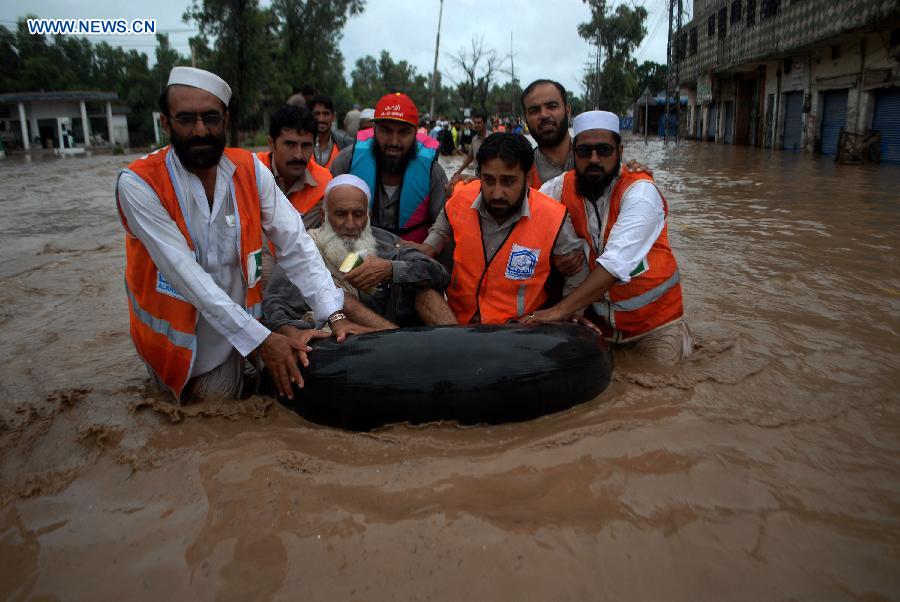 Rescuers and other people walk through flooded area in northwest Pakistan's Peshawar on July 26, 2015. At least 43 people were killed, hundreds of others injured and tens of thousands displaced in flooding and rain-related accidents in Pakistan's Punjab, Khyber Pakhtunkhwa and Balochistan, local media and officials said Saturday. (Xinhua/Umar Qayyum)
