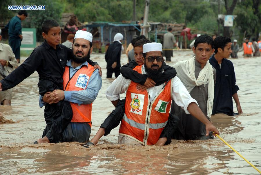 Rescuers hold children in a flooded area in northwest Pakistan's Peshawar on July 26, 2015. At least 43 people were killed, hundreds of others injured and tens of thousands displaced in flooding and rain-related accidents in Pakistan's Punjab, Khyber Pakhtunkhwa and Balochistan, local media and officials said Saturday. (Xinhua/Umar Qayyum)