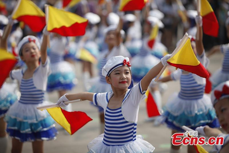 Girls dance during the opening ceremony of 2015 Tianjin International Youth Cultural Art Festival in Tianjin, north China, July 26, 2015. More than 2,000 teens from 60 countries and regions took part in the festival that kicked off on Sunday. (CNS photo/Tong Yu)