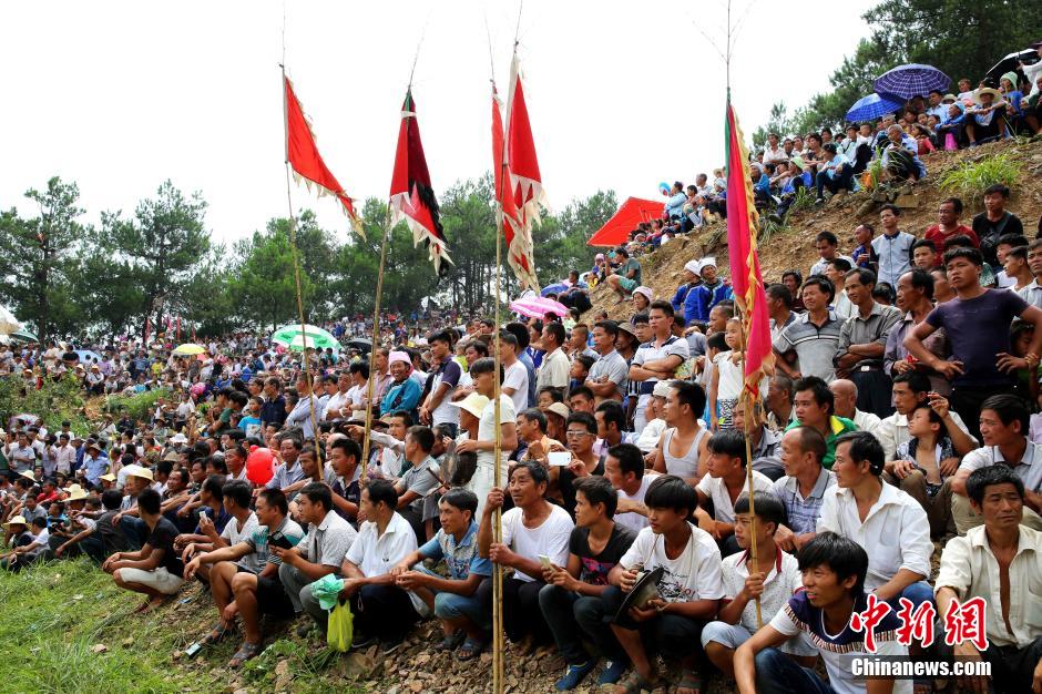 Miao people (Miao, an ethnic minority of China) celebrate traditional “Chixin Festival” in Rongjiang county, southwest China’s Guizhou province on July 22, 2015. A bull fighting competition was held for celebration. (CNS/Li Changhua)