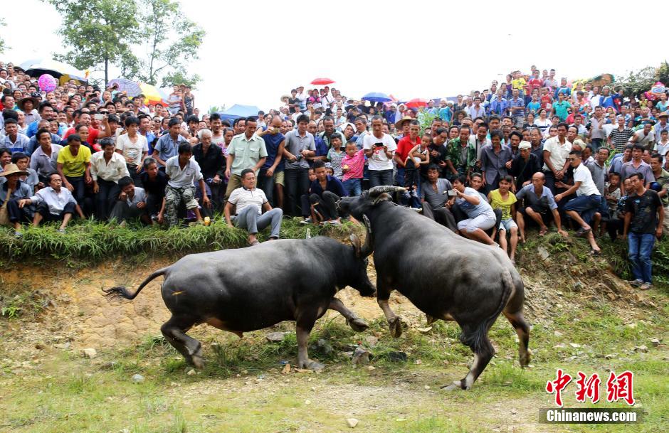 Miao people (Miao, an ethnic minority of China) celebrate traditional “Chixin Festival” in Rongjiang county, southwest China’s Guizhou province on July 22, 2015. A bull fighting competition was held for celebration. (CNS/Li Changhua)