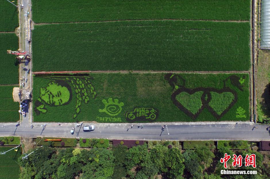 The “2015 Rice Field Cartoon Festival” is held in the testing site of “Yuan Longping super rice” Kangyuan ecological farm in Hangzhou, east China’s Zhejiang province on July 26, 2015. The agricultural science research team of Zhejiang University created cartoon works with the world’s first four-color rice in the field, which have attracted many tourists. (CNS/Li Zhong)