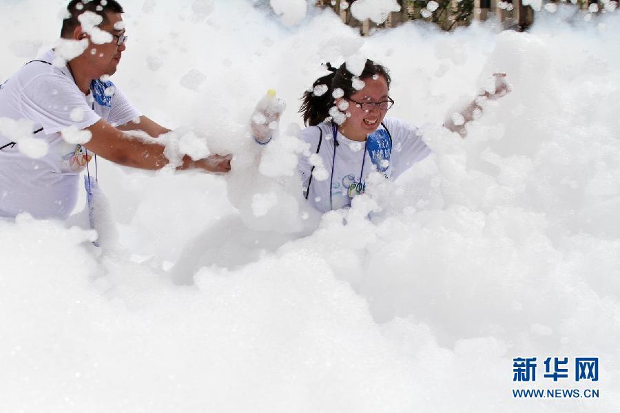 Citizens run across the “bubble rain” in Yantai, Shandong province on July 25, 2015. A bubble carnival was held in Yantai, Shandong. Hundreds of citizens ran across the “bubble rain” to experience the coolness and happiness in hot summer day. (Photo by Xinhua News Agency/ Tangke)