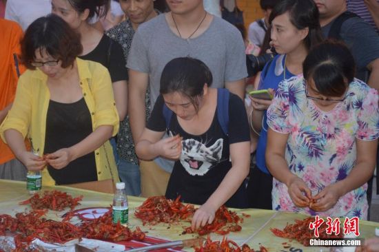 | The one-month Crawfish Festival closes in Changsha on July 25, 2015. A 2.5 meter high excavator fried 800 crawfish for 14 netizens and 10 live diners, which attracted many onlookers. (Photo by China News Agency/ Xiang Yipeng) |