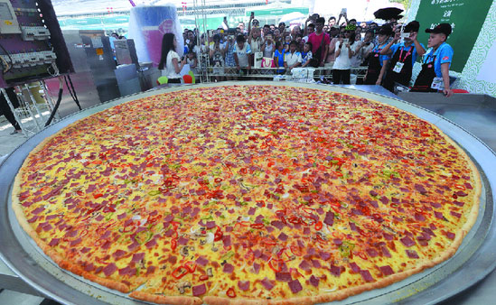 After two hours' preparation and bakery, six cooks carried out a large pizza at the fair the next day. The pizza, 3.04 meters in diameter, was made by 12 chefs with 30 kilograms of flour, 10 kilograms of pepper, 25 kilograms of cheese, 12 kilograms of beef ham, as well as 10 kilograms of mushroom.