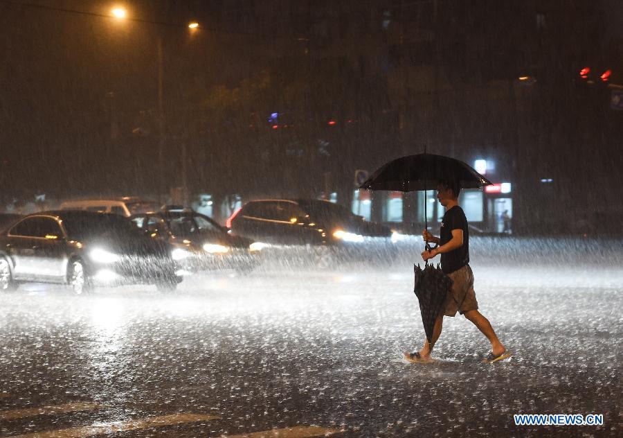 A citizen walks at a rainy night in Beijing, China, July 27, 2015. As heavy rain hit Beijing on Monday, local weather station issued a yellow signal warning for possible rainstorms. (Xinhua/Luo Xiaoguang)