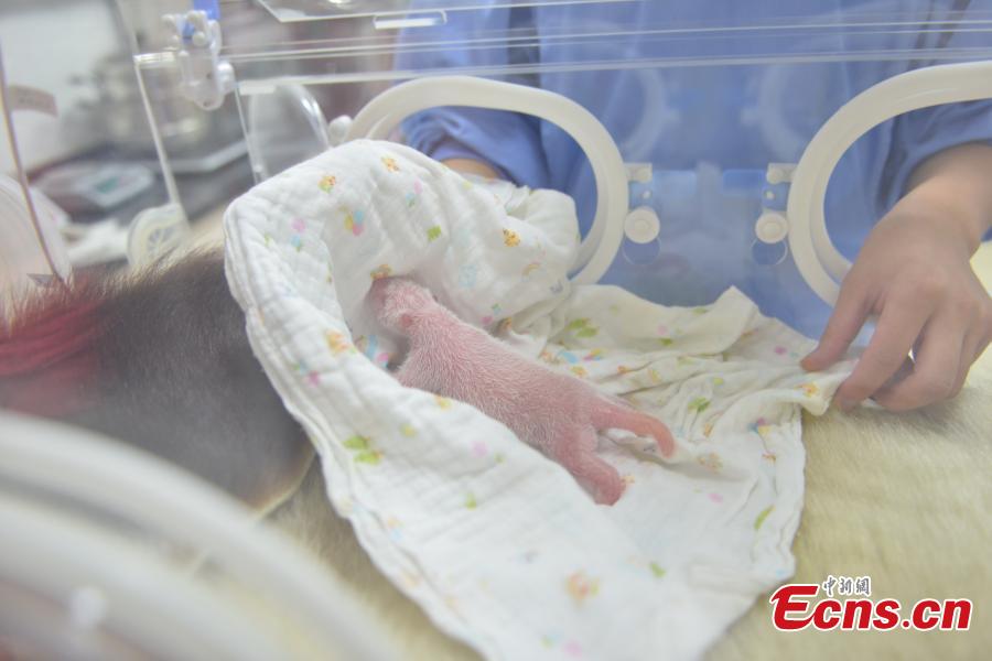 A panda cub, which weighs 200 grams, is being kept in an incubator in the Bifengxia Base of the China Conservation and Research Center for the Giant Panda in Ya’an, Southwest China’s Sichuan province, July 27, 2015. Thai-born panda "Lin Bing" gave birth to two cubs on Monday afternoon. (Photo: China News Service/Zhao Yan)