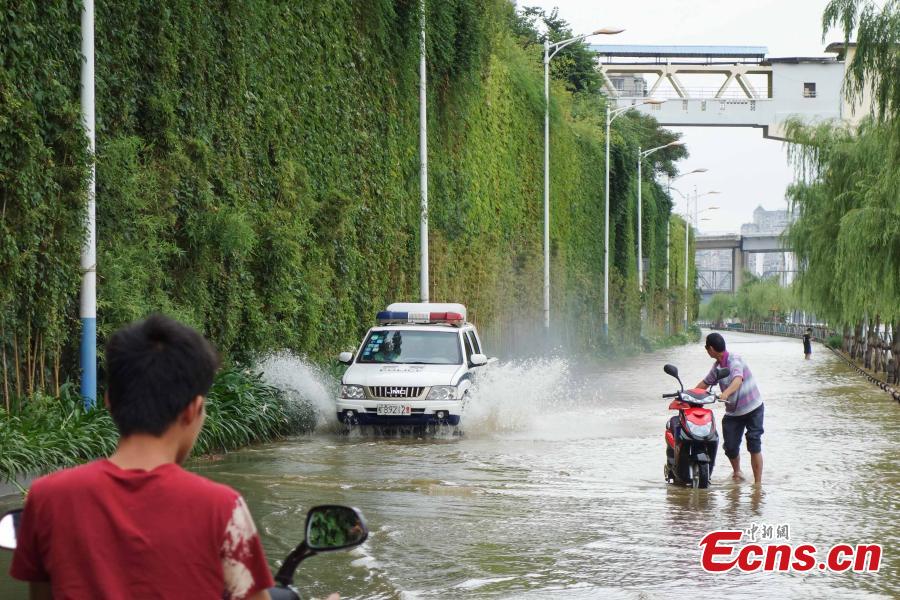 A traffic police car patrols a flooded road in Liuzhou city, Southwest China’s Guangxi Zhuang autonomous region, July 28, 2015. Rainstorms and floods have affected 262,700 people in Guangxi and 12,700 have been evacuated to safety, a local source says. (Photo: China News Service/Huang Weiming)