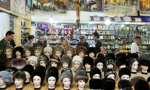 Fur hats on display in Abdullah's shop. Photo: Yu Lei