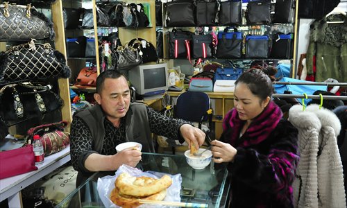 Abdullah and his wife eat a traditional meal in their shop. Photo: Yu Lei