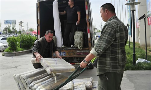 Abdullah unloads tapestries, which he ordered from Turkey, from a truck. He now visits Almaty in Kazakhstan twice a year to buy products, and places orders from other countries via telephone. Photo: Yu Lei