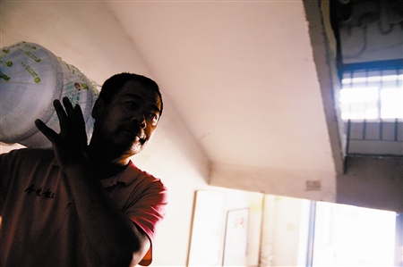 | When Li rushes to the community, he found that the elevator is out of order. He has to climb the stairs carrying the pail of water on his shoulder to the ninth floor.(Photo/Tonight News Paper) |