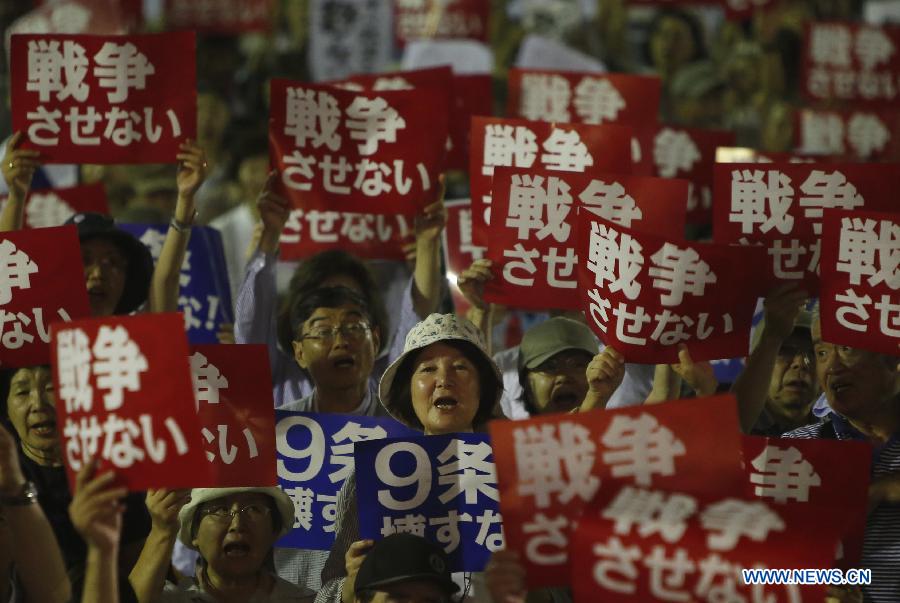 People attend a rally to protest against the security bills in Tokyo, Japan, July 28, 2015. About 15,000 people took part in the demonstration here on Tuesday. Japan's upper house of parliament on Monday began discussions on a package of controversial security bills that, if enacted, will allow for the nation's Self-Defense Forces to have an expanded role abroad, despite an ongoing public backlash that has seen hundreds of thousands took to the streets in protests. (Xinhua/Stringer)