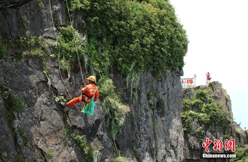 Every year, environmental protection volunteers come to Mt. Emei and pick up garbage. This year, many children also join the team and help protecting environment together with these "spidermen."