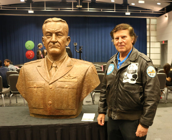 Dan Petach poses on Monday with a sculpture of General Claire Lee Chennault, commander of the Flying Tigers, or the American Volunteer Group, during WWII in China helping the Chinese fighting Japanese aggressors. Dan's uncle John Petach served in the Flying Tigers in China. An exhibit, titled Welcome Home, Flying Tigers, is being held on July 27-28 at the Ronald Reagan Building in Washington. [Photo by Chen Weihua/China Daily]
