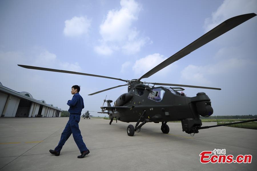 A pilot walks past a Z-10 helicopter at a base in Liaocheng, East China’s Shandong province, July 28, 2015. The "Thunder" aerobatics team is the first helicopter aerobatics team of army aviation in the Chinese People's Liberation Army (PLA). Li Kuiyuan has a safe flight record of 7,000 hours, and he is also the first in the country to turn armed helicopter somersaults. The team will stage air shows at the 3rd China (Tianjin) International Helicopter Exposition scheduled in September. (Photo: China News Service/Tong Yu)