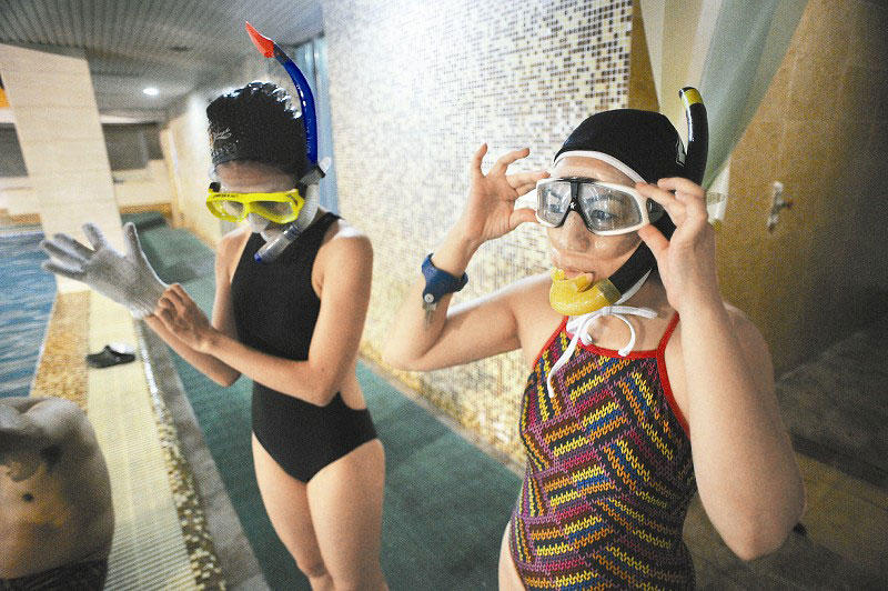 Two underwater hockey players have a rest at a swimming pool in Chengdu, capital of southwest China’s Sichuan Province. (Sichuan Daily/Xiao Yuyang)